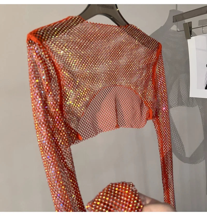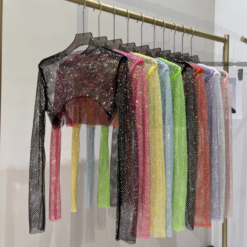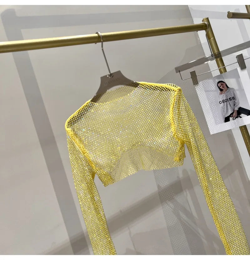Bright diamond short top Slim thin Ms. hot drill long-sleeved T-shirt sexy leak waist nightclub
