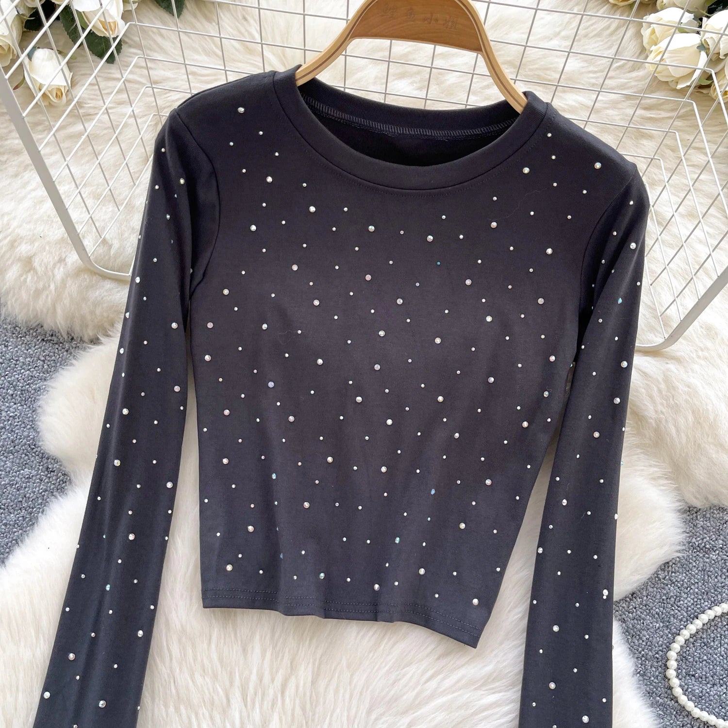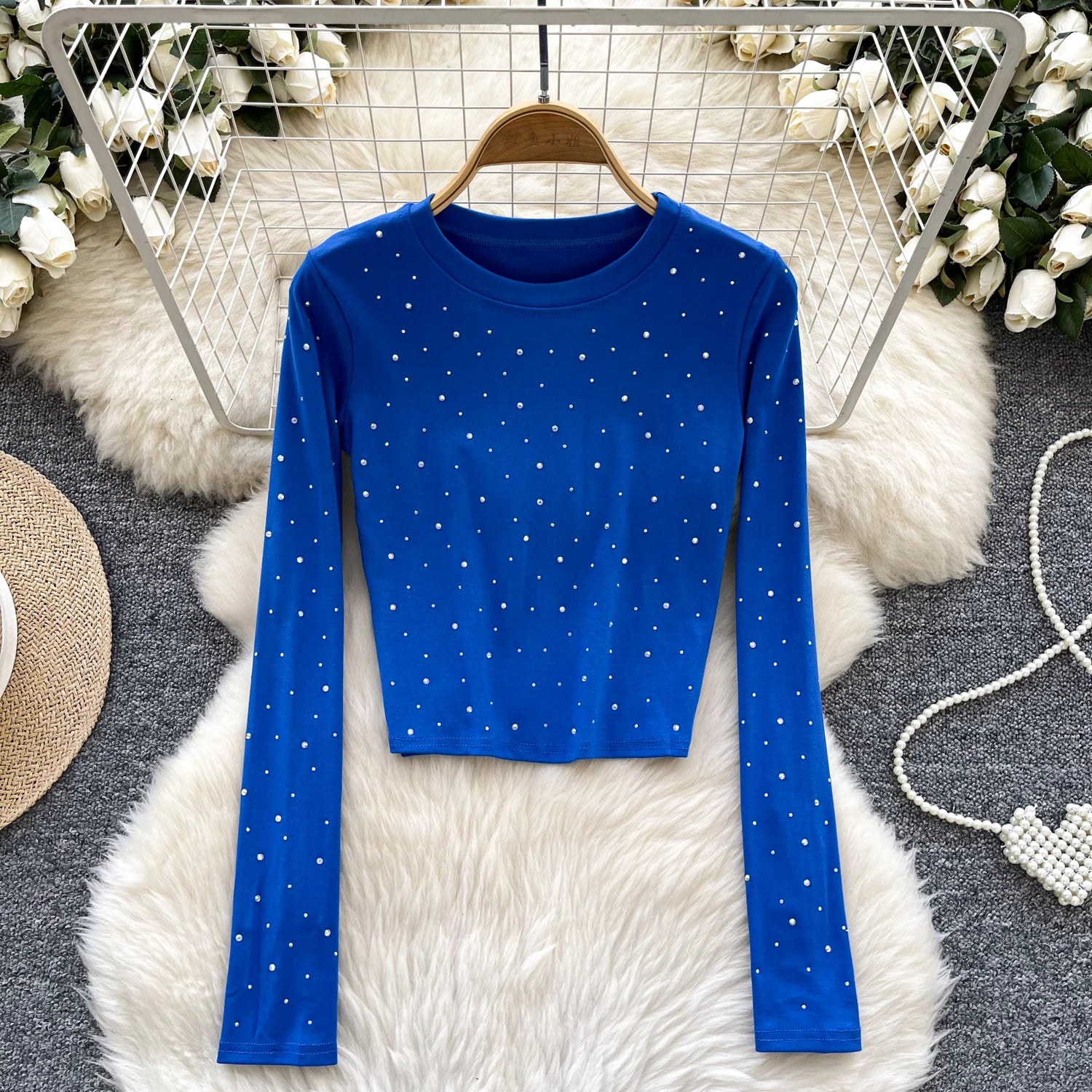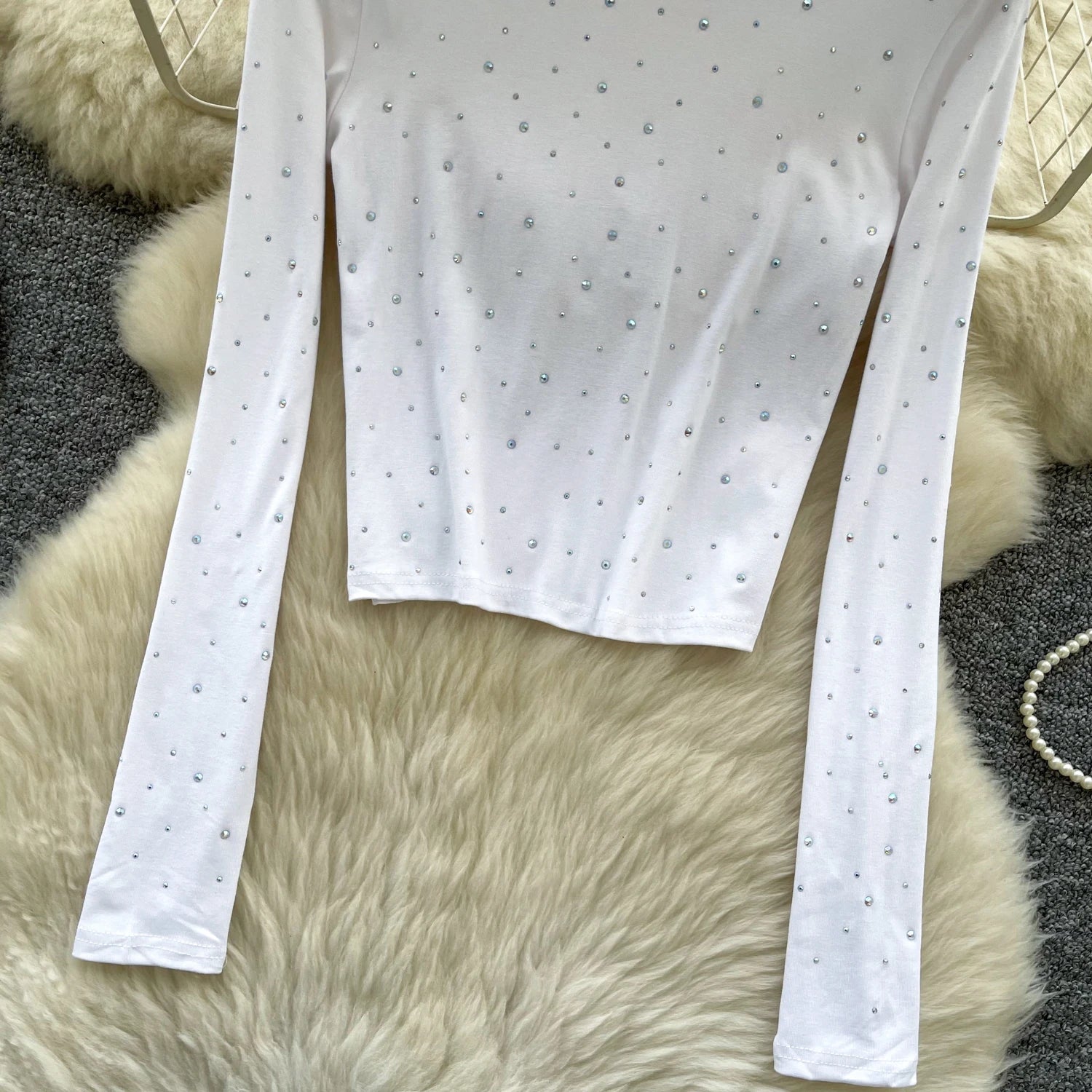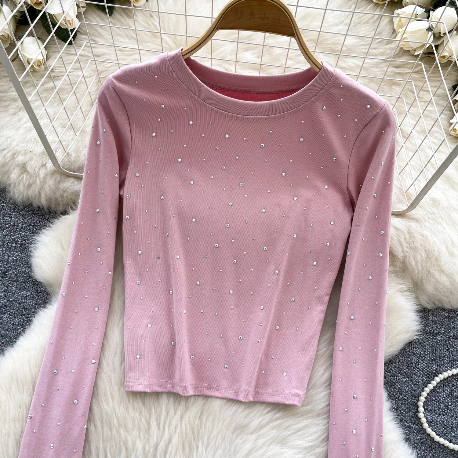 Long Sleeves Hotsweet O-neck Fashion Rhinestone Slim Top French Streetwear Sexy High Street Autumn Winter Women T-Shirts
