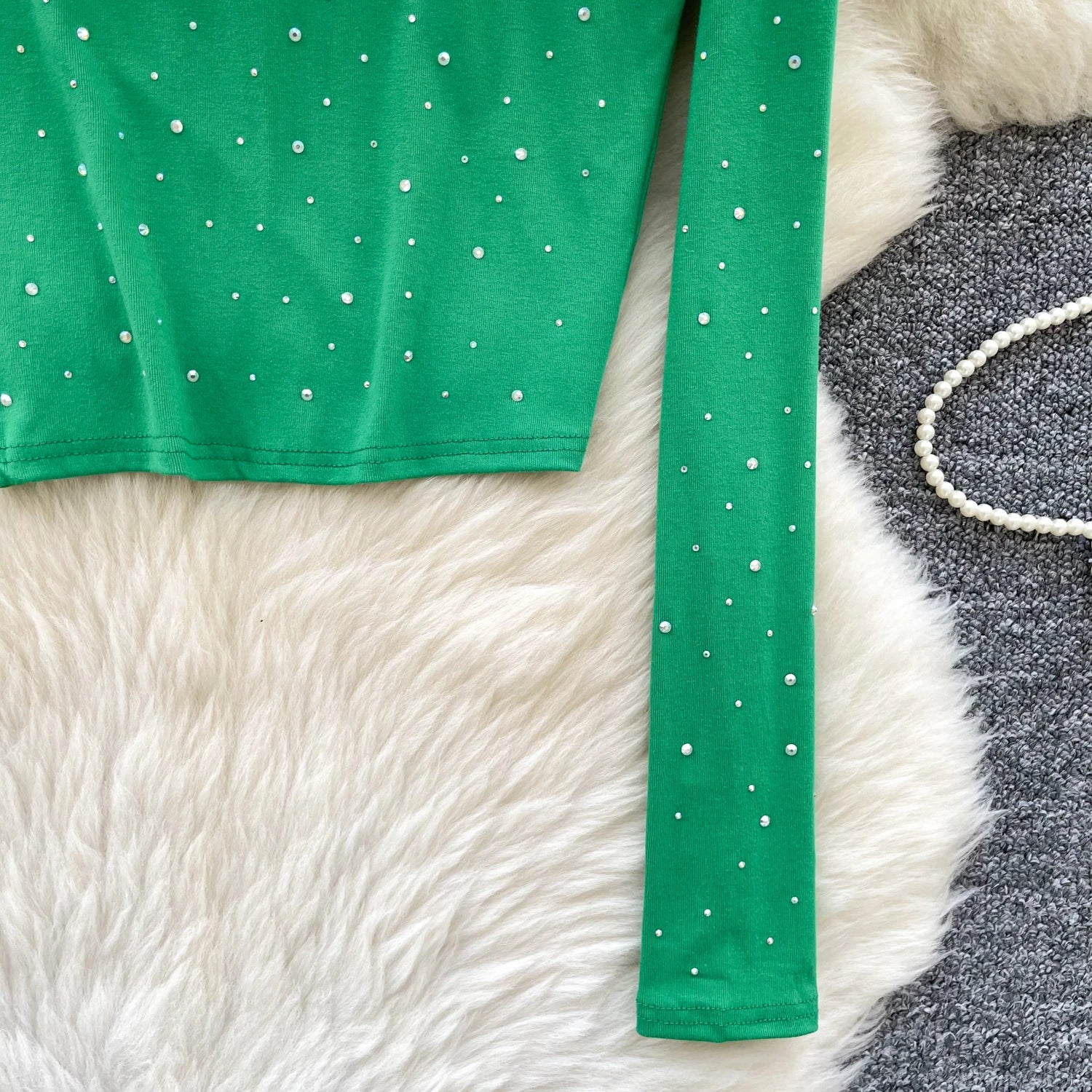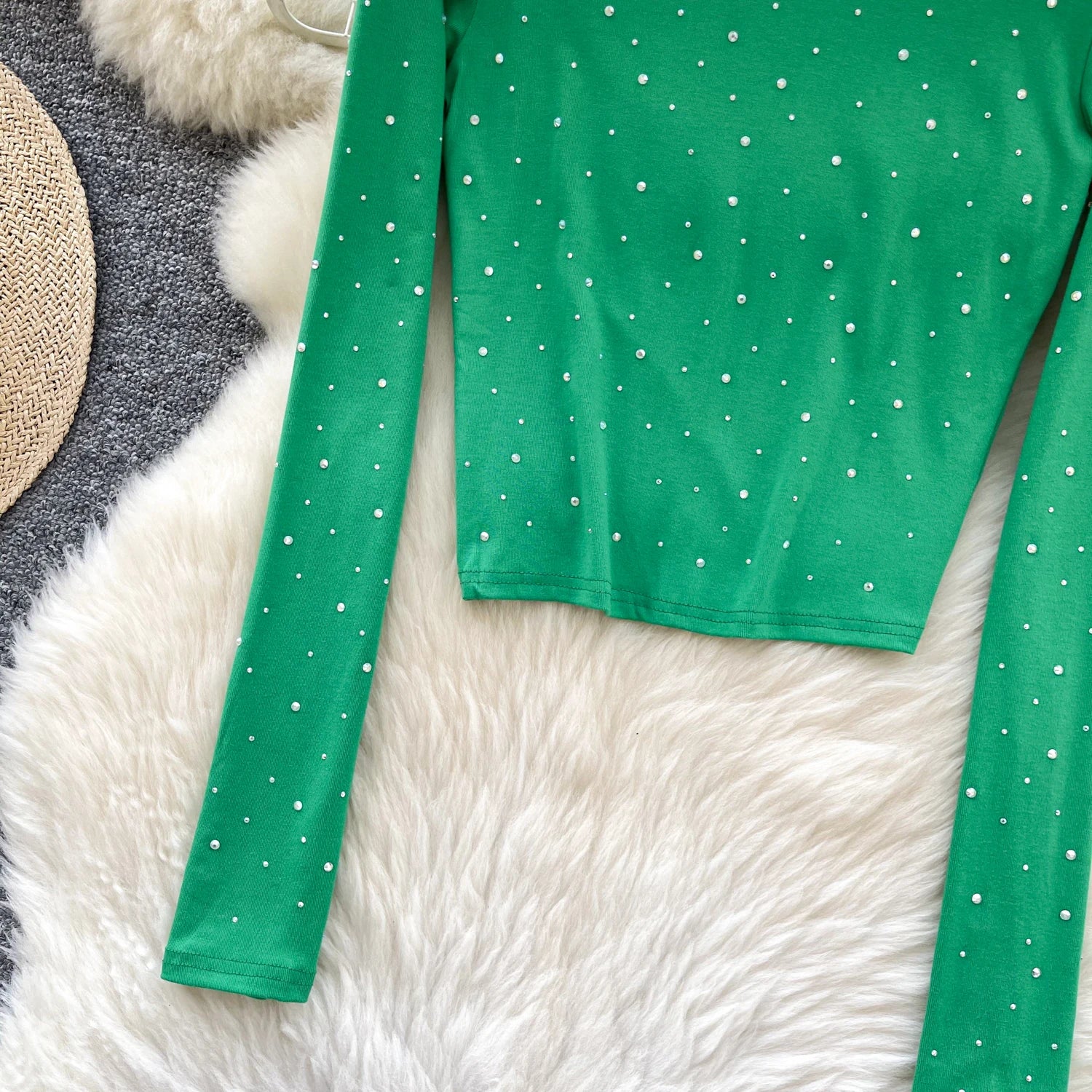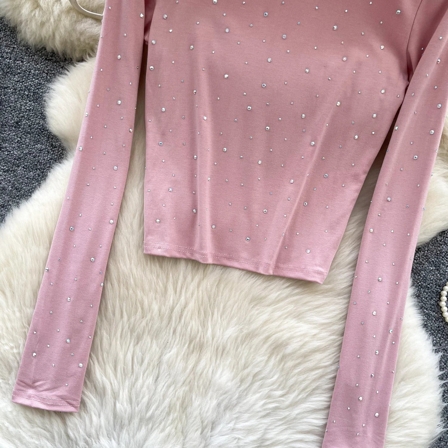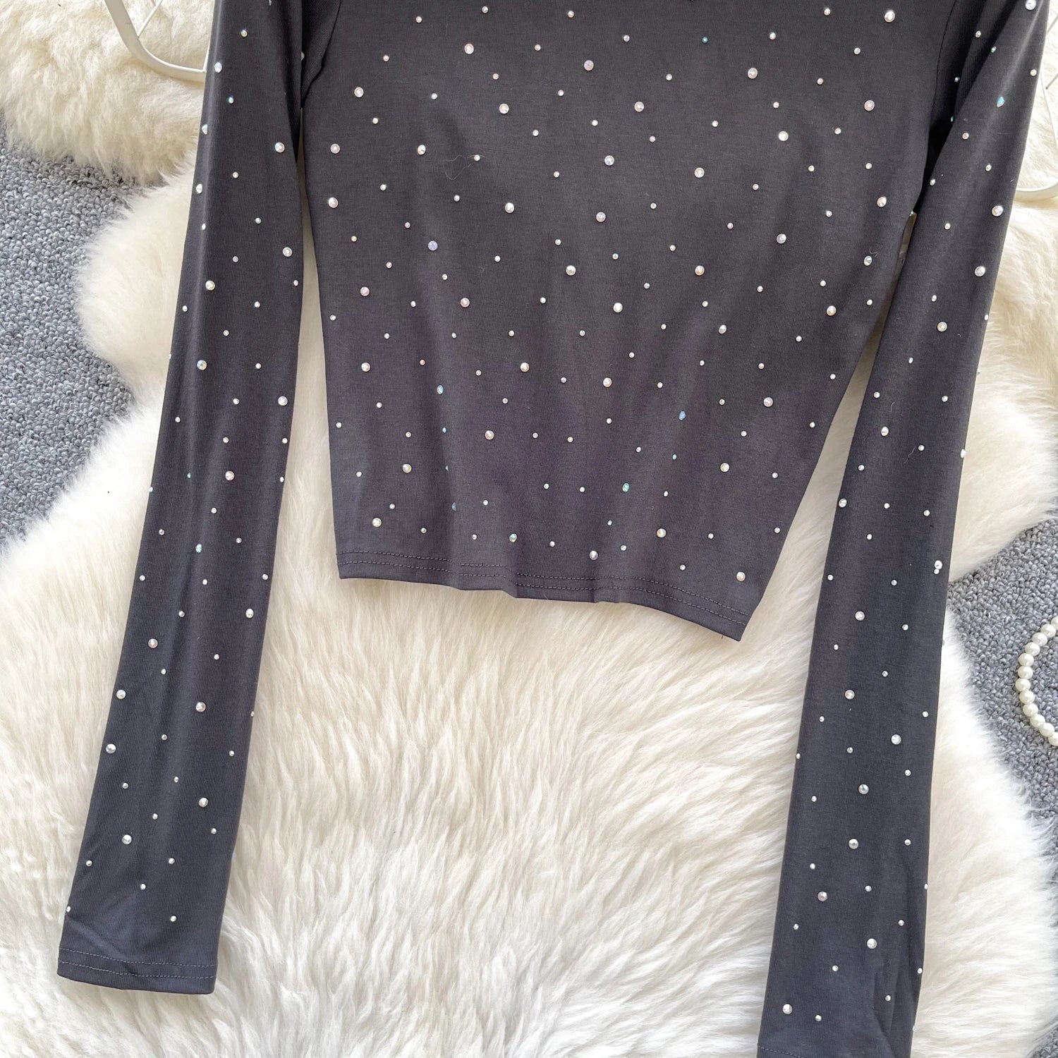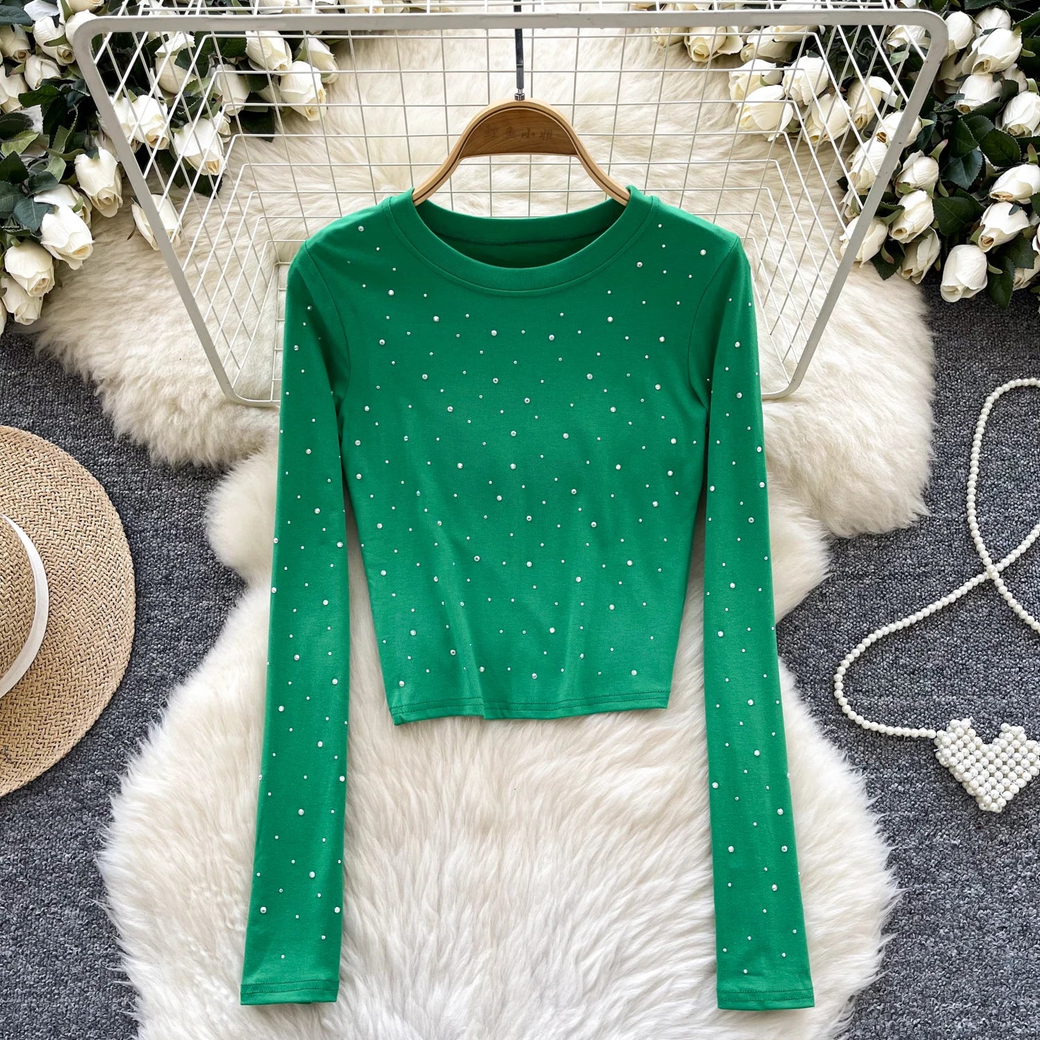Long Sleeves Hotsweet O-neck Fashion Rhinestone Slim Top French Streetwear Sexy High Street Autumn Winter Women T-Shirts