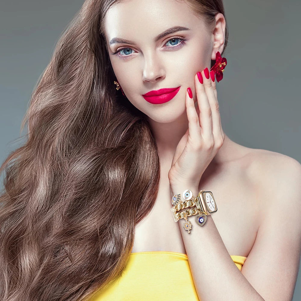 Stylish Metal Charms Watch Strap Compatible with Apple Watch Bands 38/40/41/42/44/45/49mm Replacement Strap with Unique Pendants