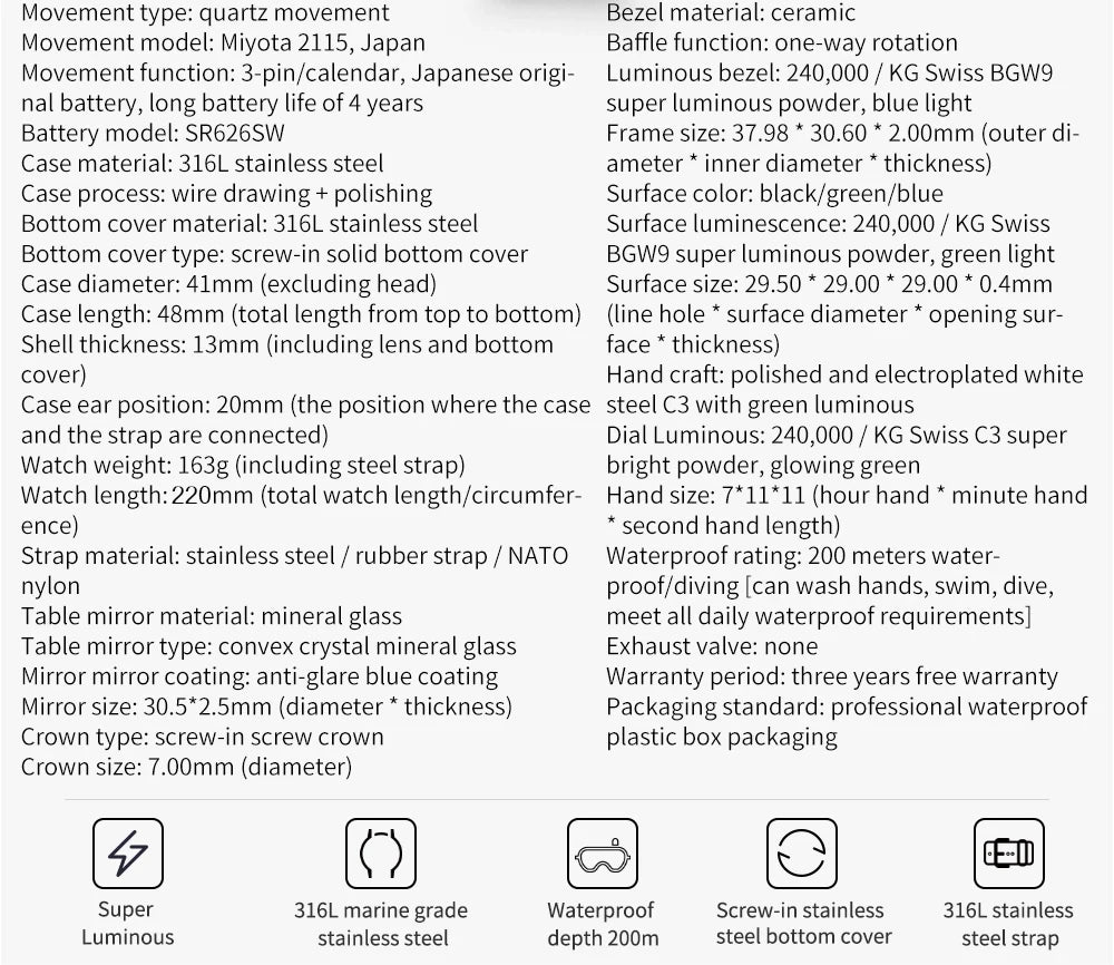 Feature: Screw crown,Luminous,Auto Date,Complete Calendar,DIVER,Water-Resistance,swim,Luminous Hands
