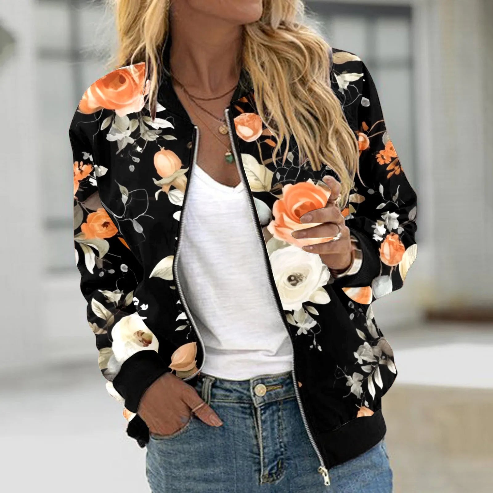Autumn Bomber Jacket For Women Fashion Flower Print Outwear Stand Collar Zipper Baseball Coat Elegant Slim Basic Ladies Jackets