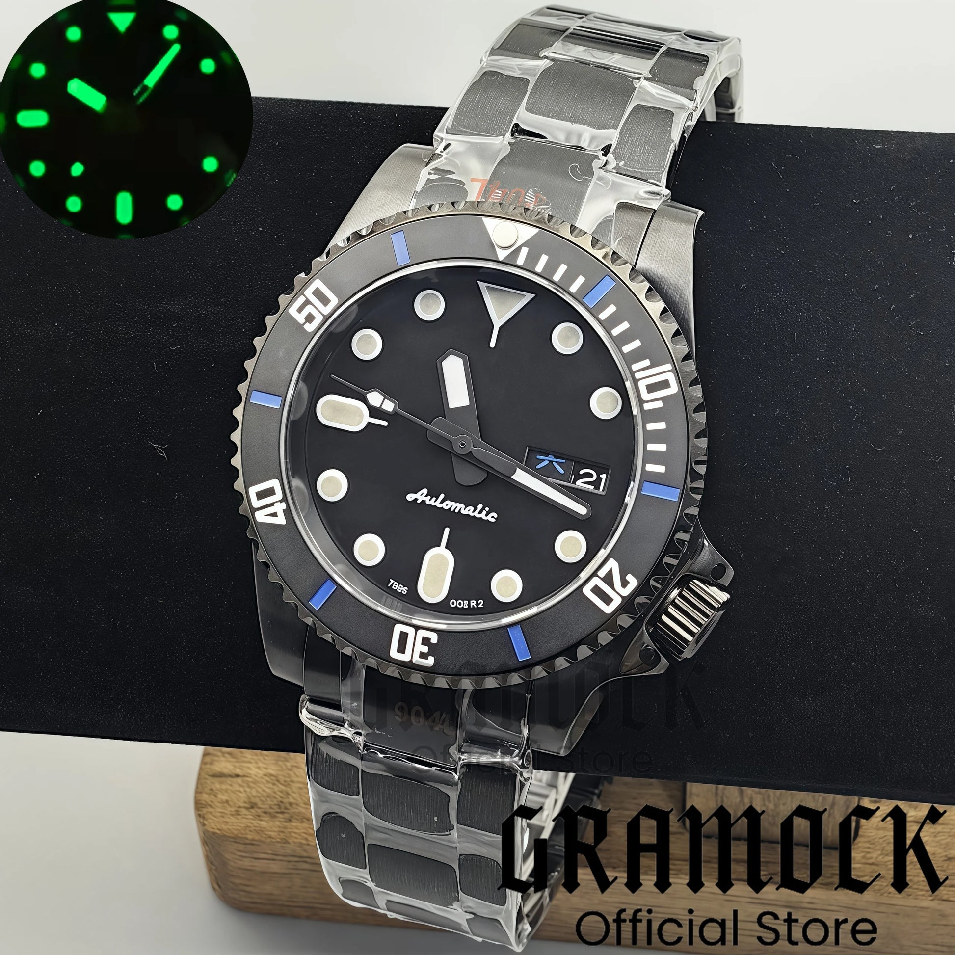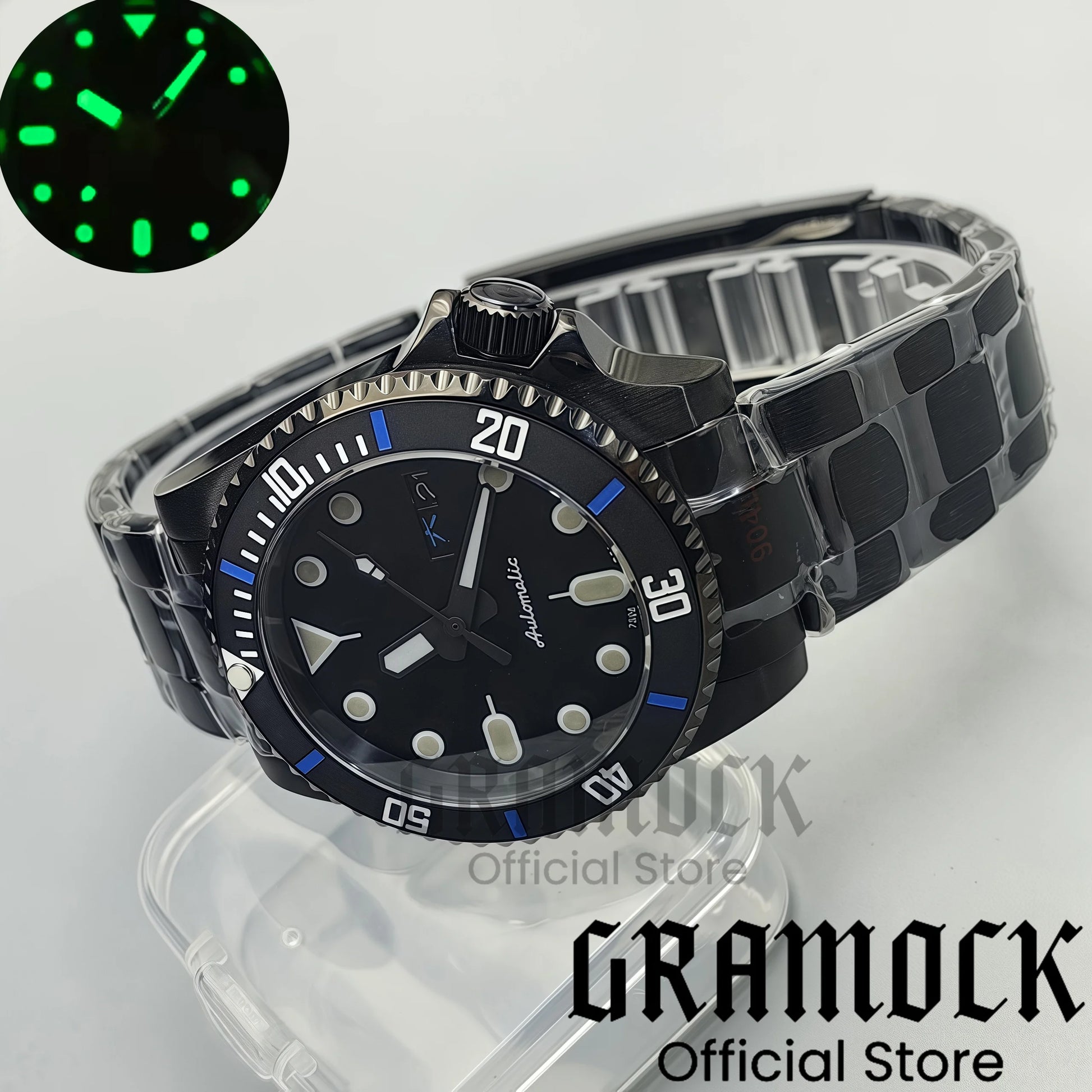 Gramock 40mm Men's Watch NH36 Movement Week-day Display Function Full Black Dial PVD Case Curved End Rubber Strap Waterproof