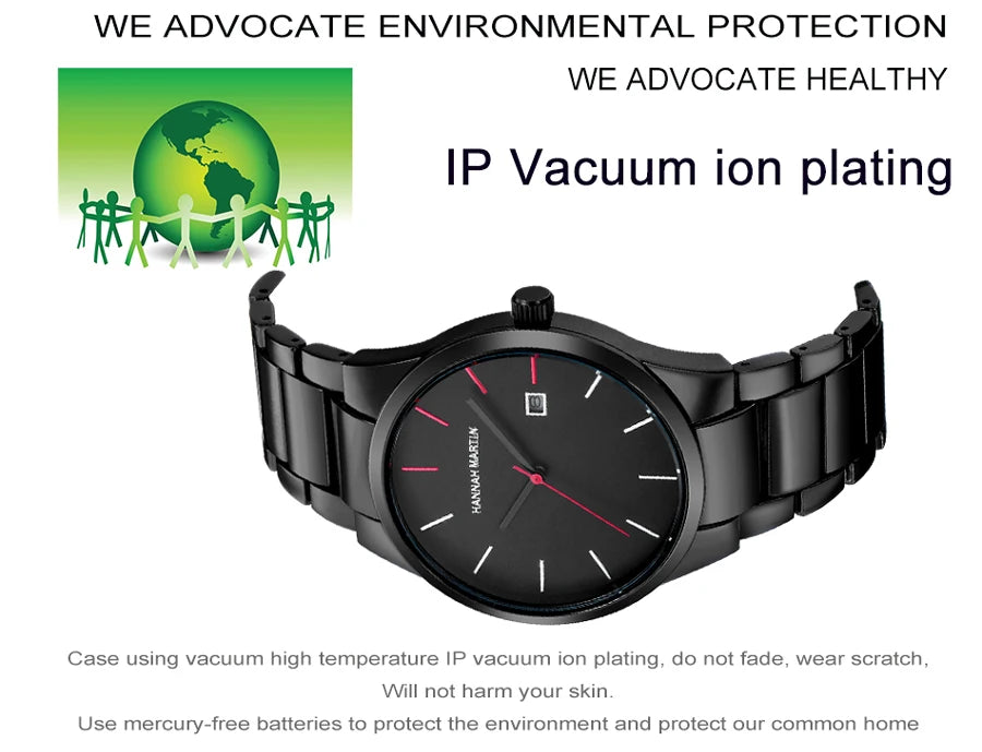 Hannah Martin Men's Stainless Steel Watch Fashion Business Style Black Minimalist Style 3Bar Waterproof Quartz Movement Watches