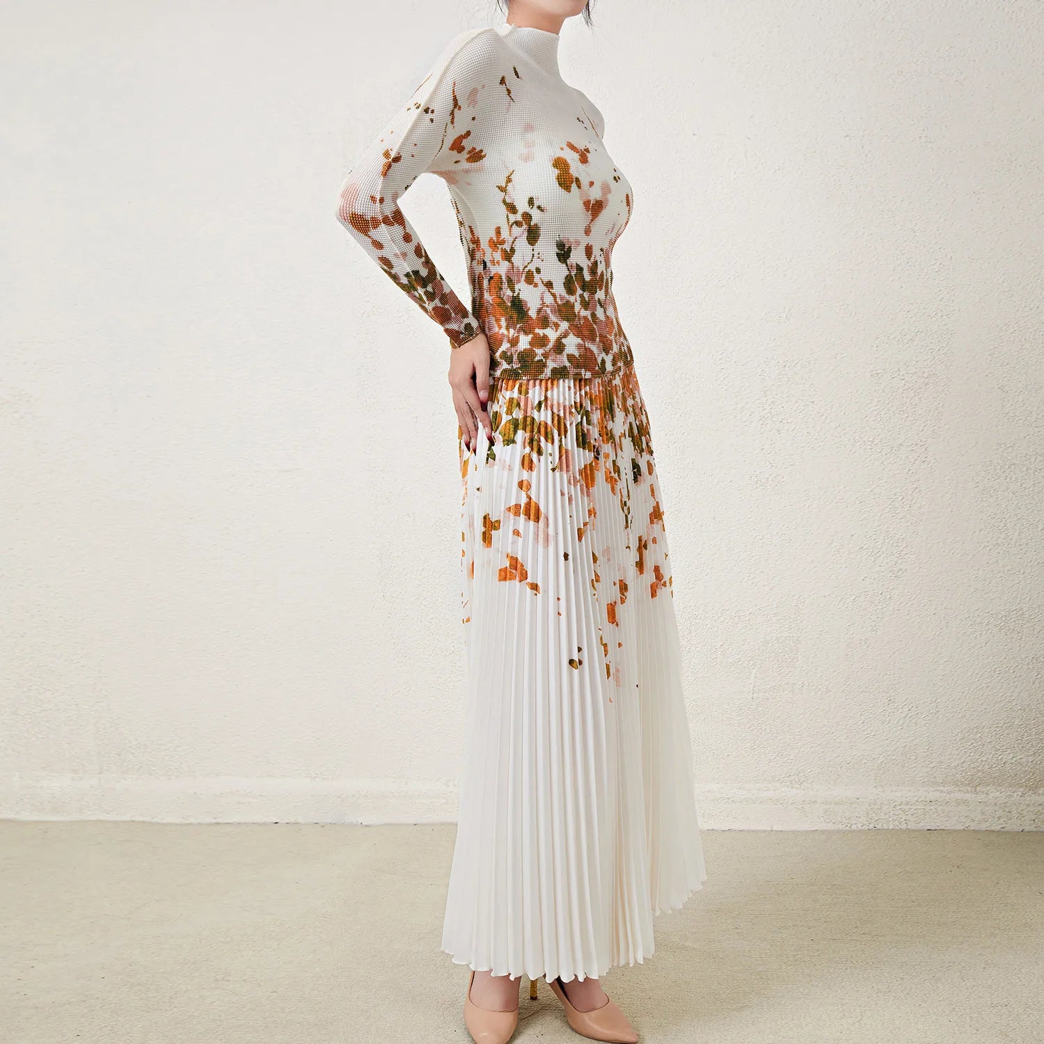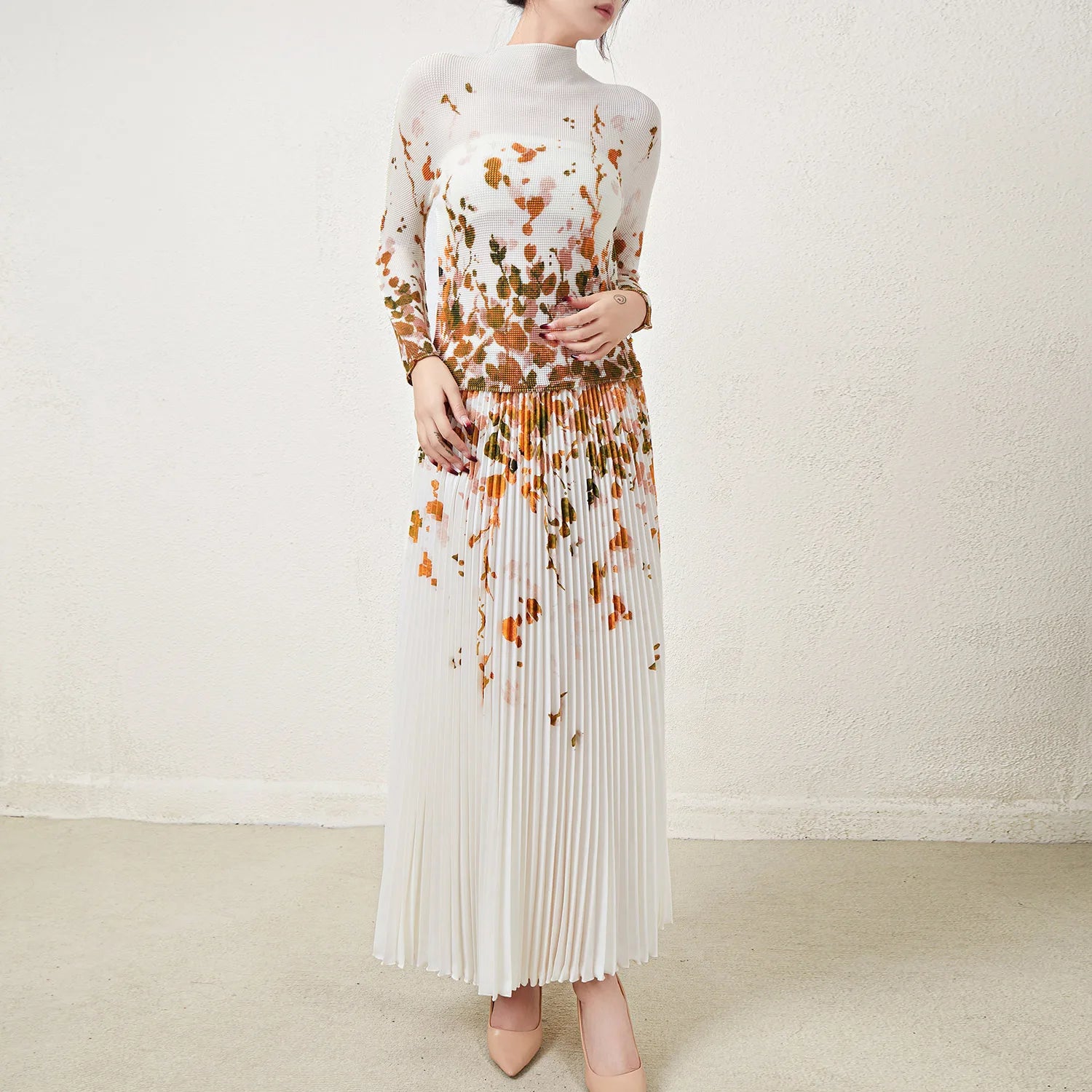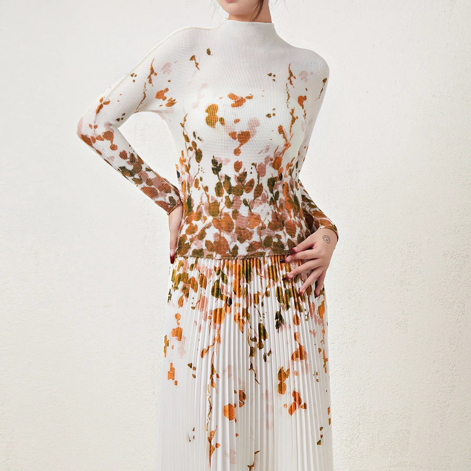 Pleated Top and Pleated Skirt Printed Elastic Stretch Free Size Two Piece Skirt Set